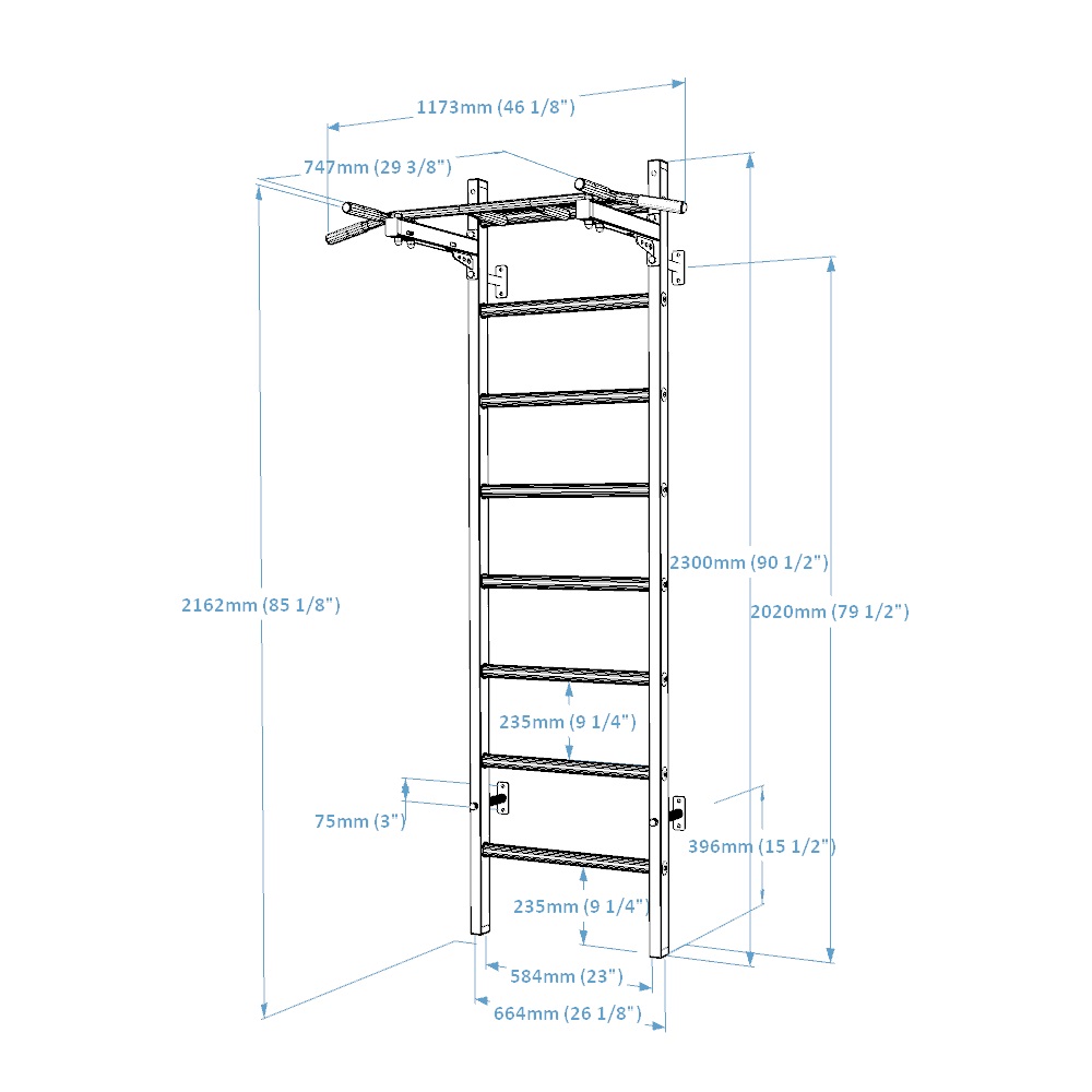 Ein Vorteil der BenchK Sprossenwand Serie 2 ist es, dass jedes Element mit Leichtigkeit auf die passende Höhe eingestellt werden kann. Diese Sprossenwand ist daher eine perfekte Ergänzung für jede Wohnung bzw. jedes Büro und eignet sich auch für kommerzielle Einrichtungen. Aufgrund der geringen Höhe von 230cm passt die Serie 2 nahezu in jeden Raum.