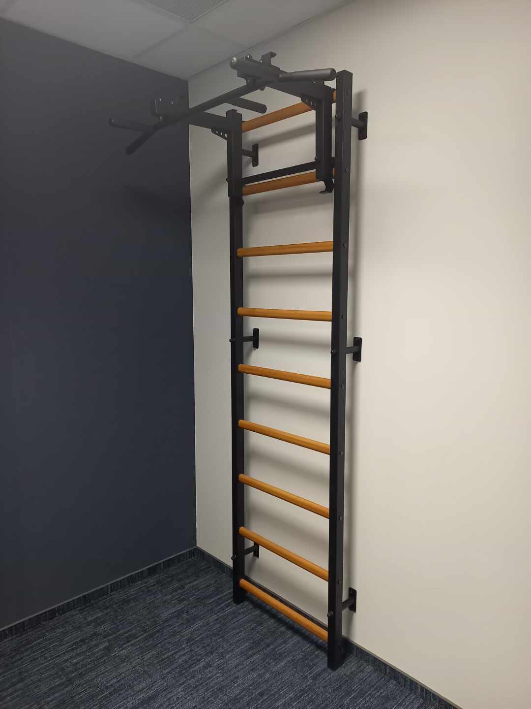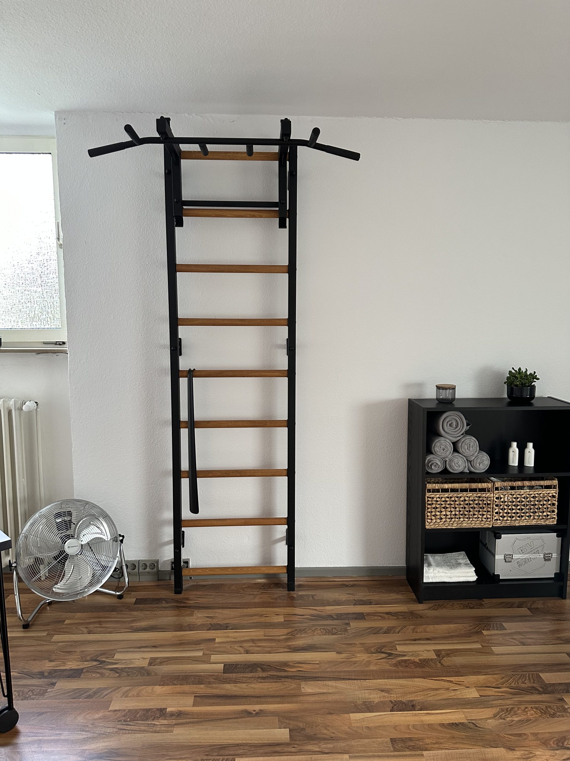 Eine Wandmontage an einer Trennwand dünner als 12 cm und an einer Gipskartonwand ist nicht möglich. Die Entscheidung und Verantwortung für die Montageart der Sprossenwand liegt beim Auftraggeber.