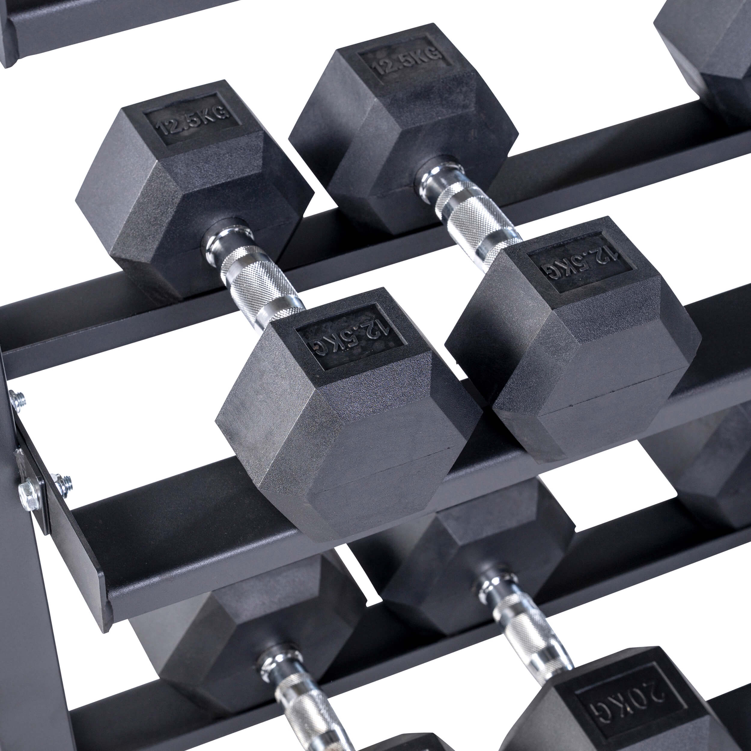 Unseren Hexagon Hantelsatz PVC mit 3-Reihiger Ablage gibt es wählbar in 2,5kg – 25kg (10 Hantelpaare) und 2,5kg – 30kg (12 Hantelpaare)