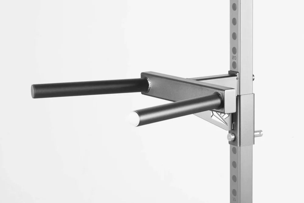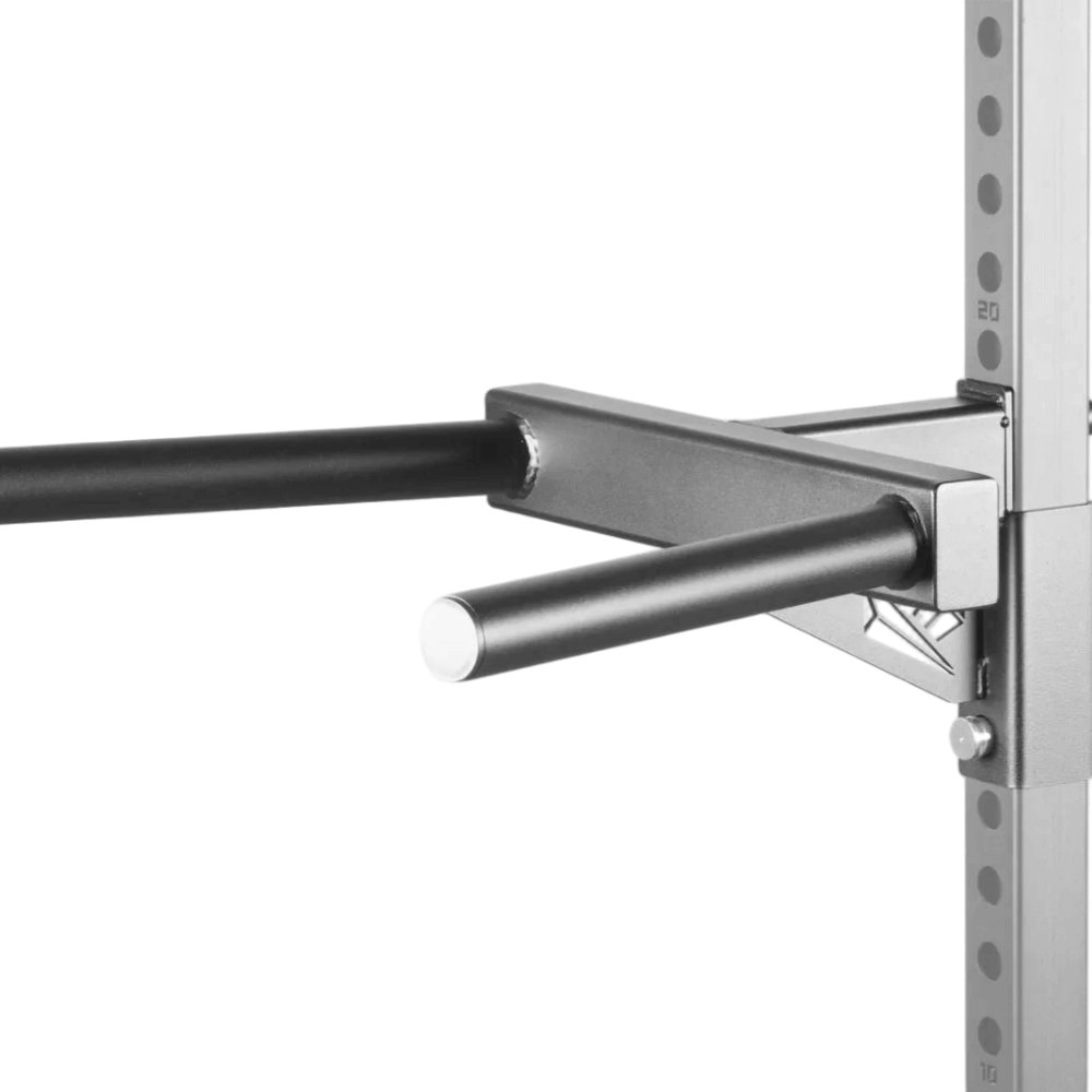 Die Montage der Front Fit Dip Bar ist einfach: Sie wird einfach über einen Bolzen an der Vorderseite des Rigs oder Racks befestigt und ist danach sofort einsatzbereit. Die Montagebolzen sind im Lieferumfang enthalten.