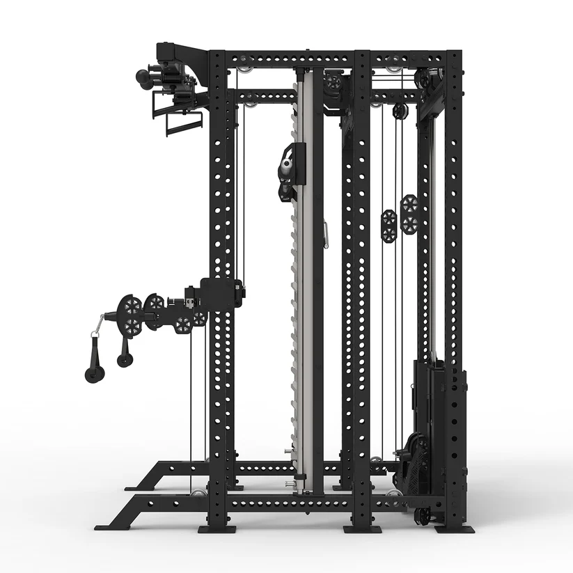 - Half Power Rack, Functional Trainer, Smith Machine, Lat Pulldown/Low Cable Row und optional Vertical Leg Press mit Smith Machine Leg Press-Aufsatz